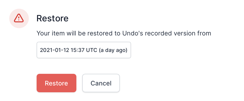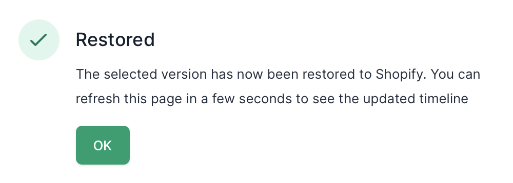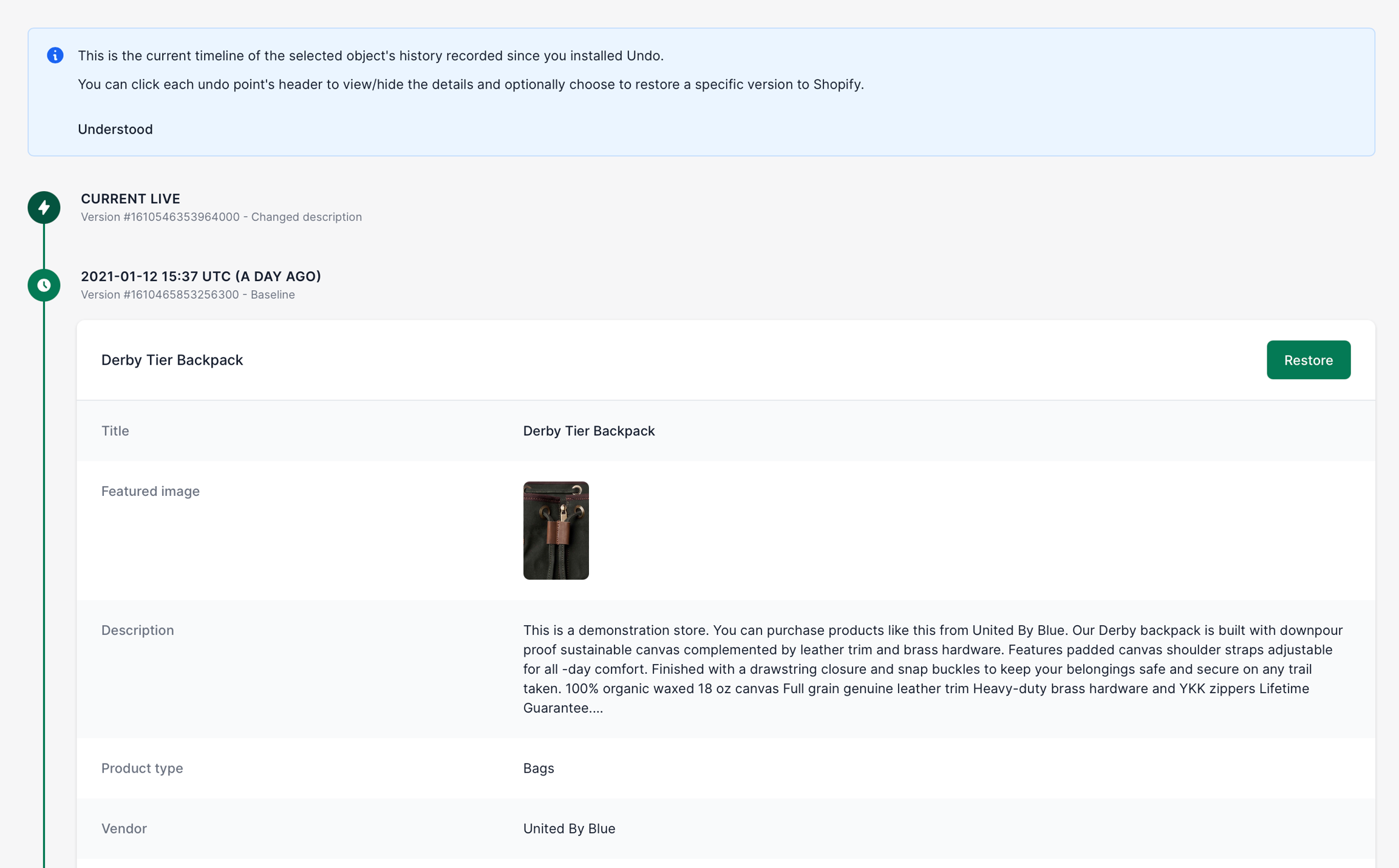 The version just restored is now the current live version in Shopify and Undo's recording of the previous current live version is now the most recent undo point. If you choose to restore this version, you'll effectively revert the previous operation and return to the original live version.